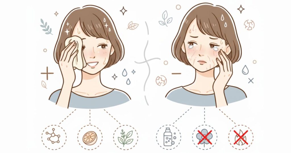 👉 解決策:カモミールやアロエベラなどの鎮静成分を含む化粧水を取り入れて、肌を落ち着けましょう。