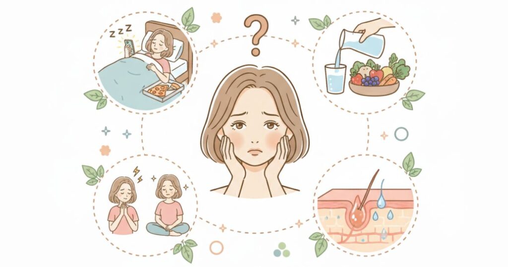 • 生活習慣やストレス:睡眠不足・偏食で皮脂や乾燥が悪化