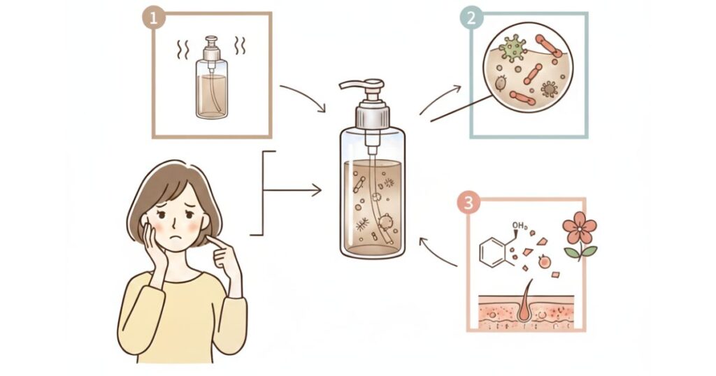 キャップの開け閉めのたびに混入した雑菌が内部で増殖し、化粧水全体を“菌の温床”にしてしまうのです。