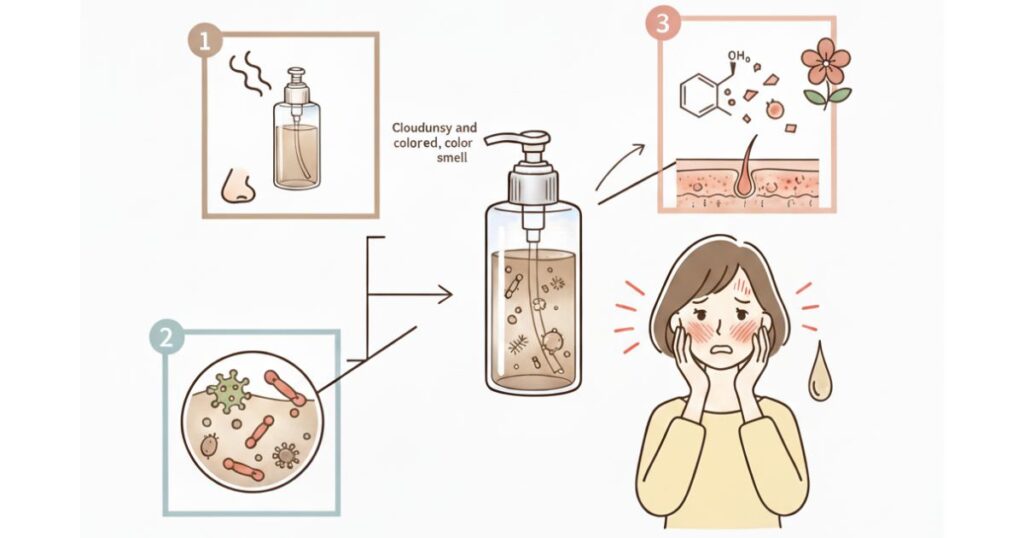期限を過ぎた化粧水には、目に見えない変化=危険サインが潜んでいます。