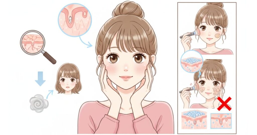 肌表面が乾燥していると、ファンデーションが均一にのらず、粉浮きやヨレが起こりやすくなります。