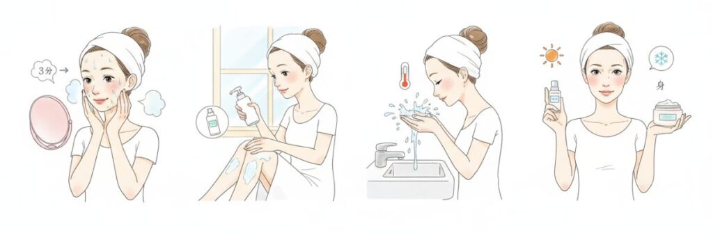 乾燥肌対策は「水分を入れて・抱えて・逃がさない」という3段階ケアが基本。この流れを意識することで、潤いを長時間キープできる肌に近づけます。