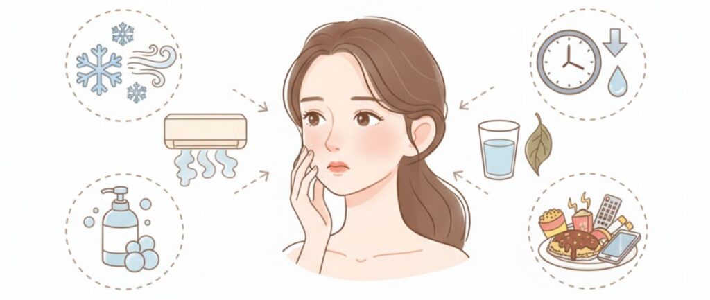 乾燥は単なる“見た目の問題”ではなく、敏感肌や肌荒れを引き起こすリスクもあるため、早めの対策が必要です。