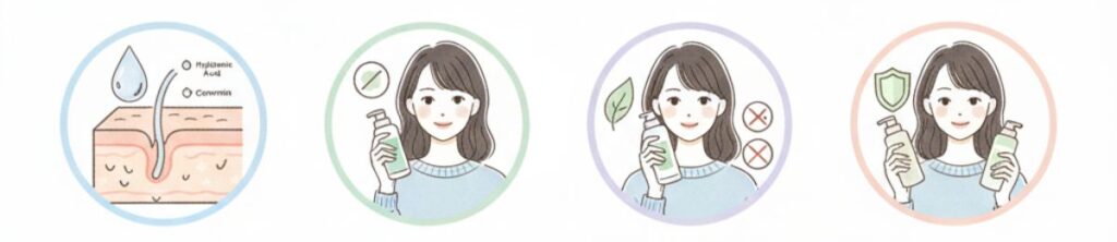 • 乾燥肌:ヒアルロン酸、セラミド、グリセリン配合を選ぶ