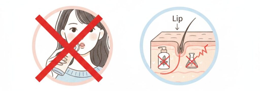 唇は皮脂腺がなく、バリア機能が弱いため化粧水の成分(アルコールや香料)が刺激になることがあります。