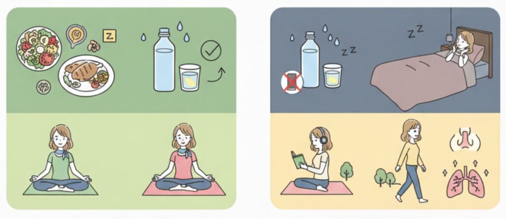• ストレス対策:ヨガ、散歩、読書、深呼吸など
