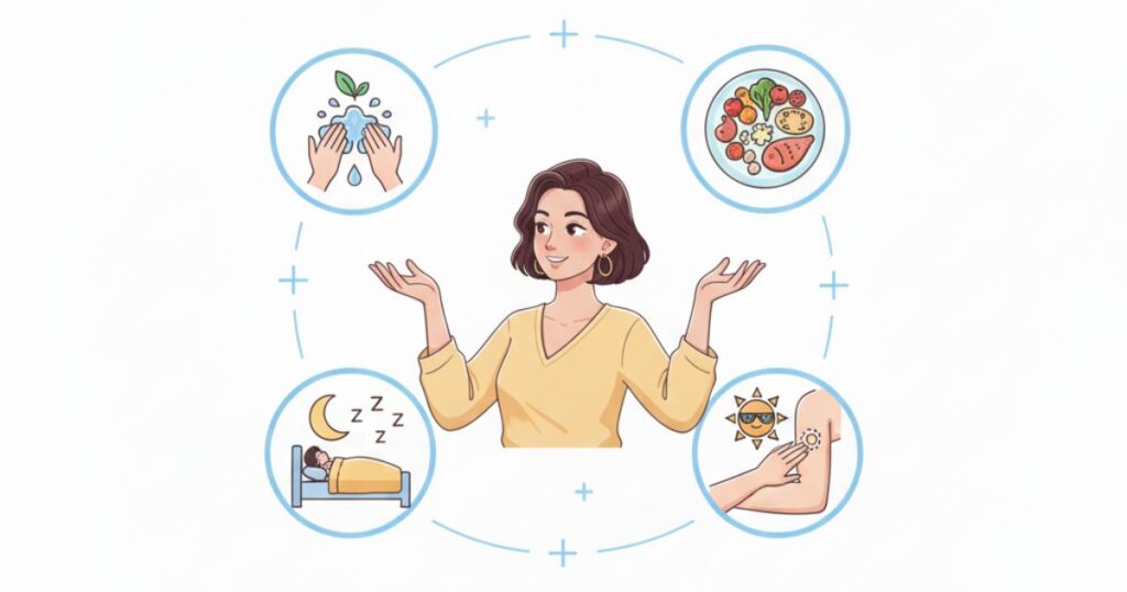 ビタミンC・E、タンパク質、オメガ3脂肪酸などを意識する。 - 質の高い睡眠