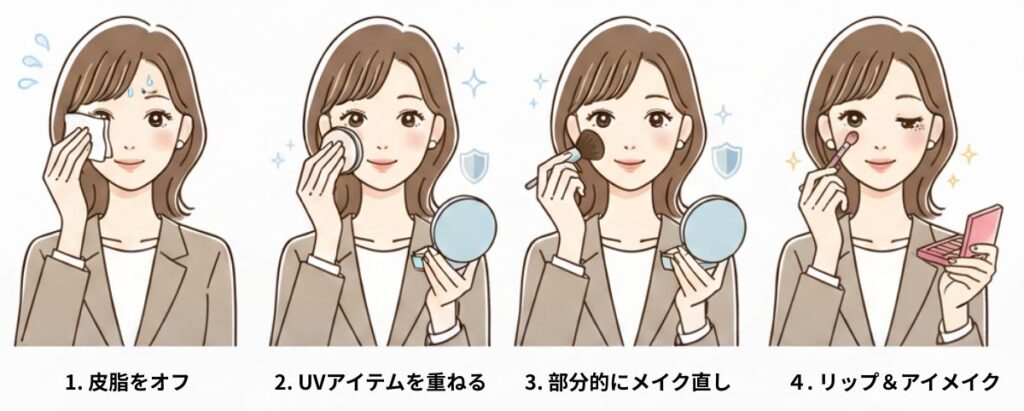 ティッシュやあぶら取り紙で優しく押さえる。ゴシゴシこすらないのが鉄則。 - UVアイテムを重ねる