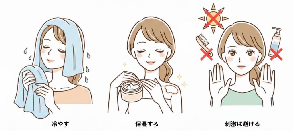 ヒアルロン酸やセラミド配合の化粧水・乳液で水分補給。特に「冷蔵庫で冷やした化粧水」を使うと心地よさも◎。 - 刺激は避ける