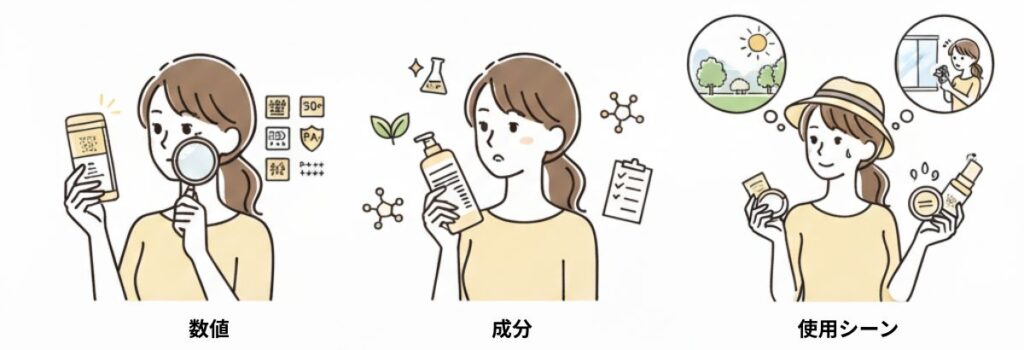 UVケアアイテムを選ぶときは、数値・成分・使用シーンを意識しましょう。