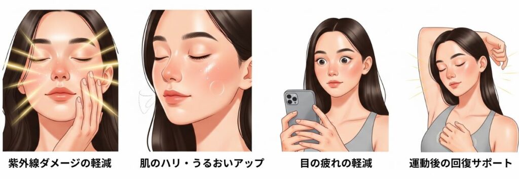 酸化ストレス対策だけでなく、以下のような美容・健康サポートも研究されています。